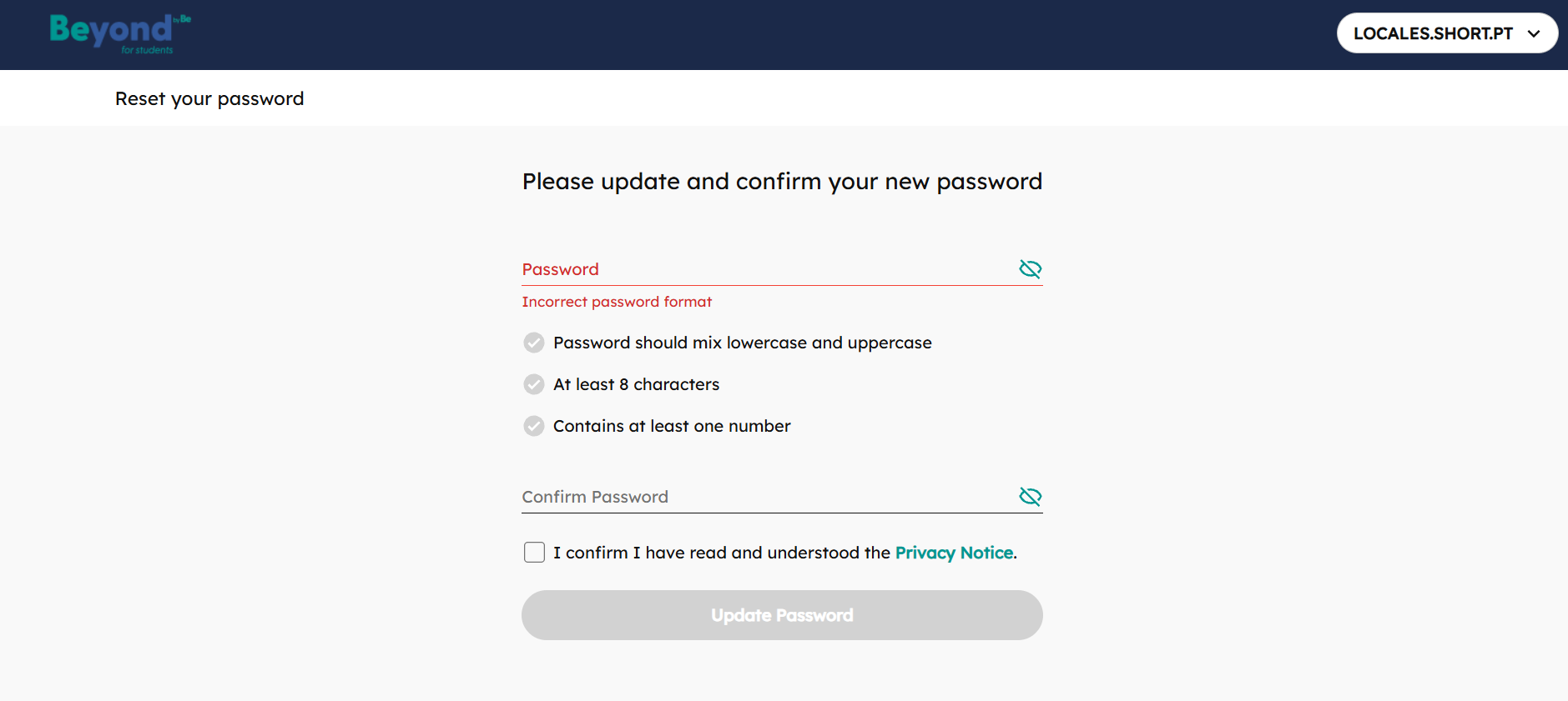 Crie uma nova senha seguindo os critérios e clique no botão Update Password
