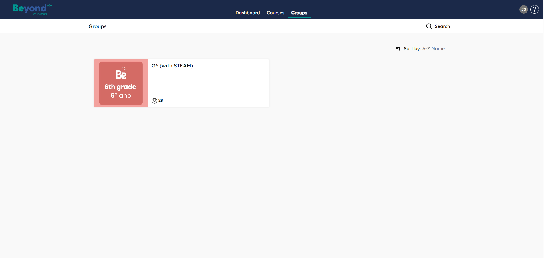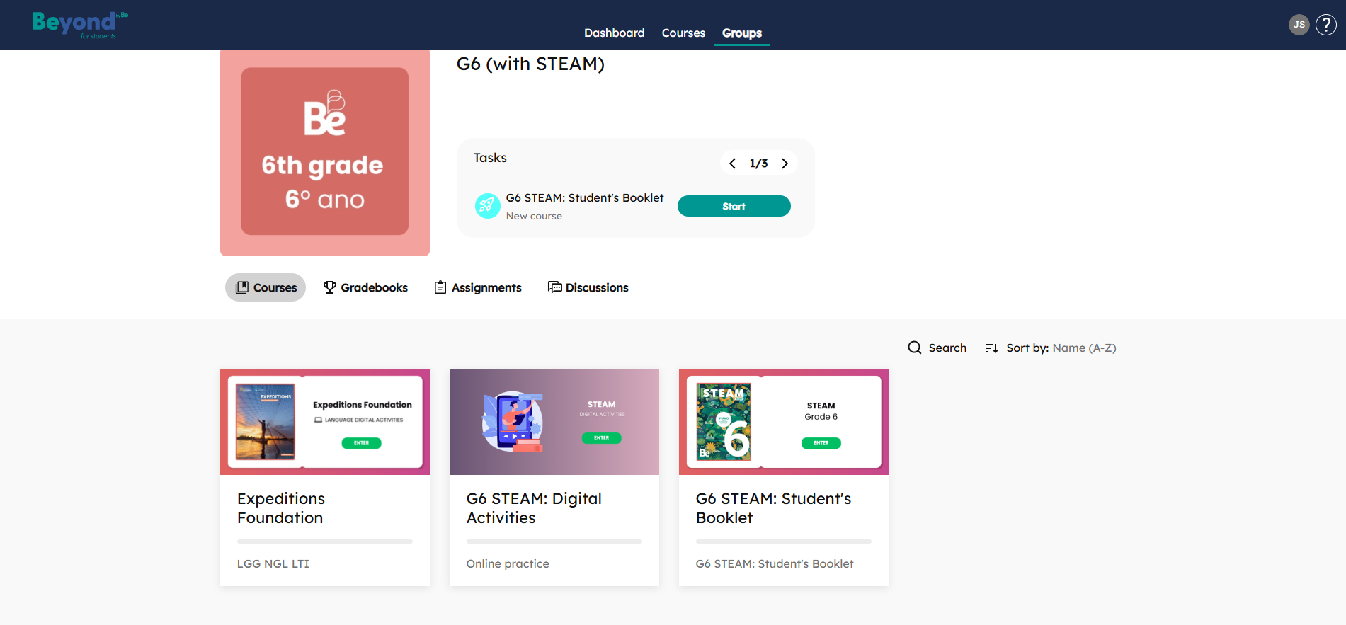 Na Beyond for Students, todos os conteúdos da sua turma ficam organizados no menu Groups > Nome da sua turma.